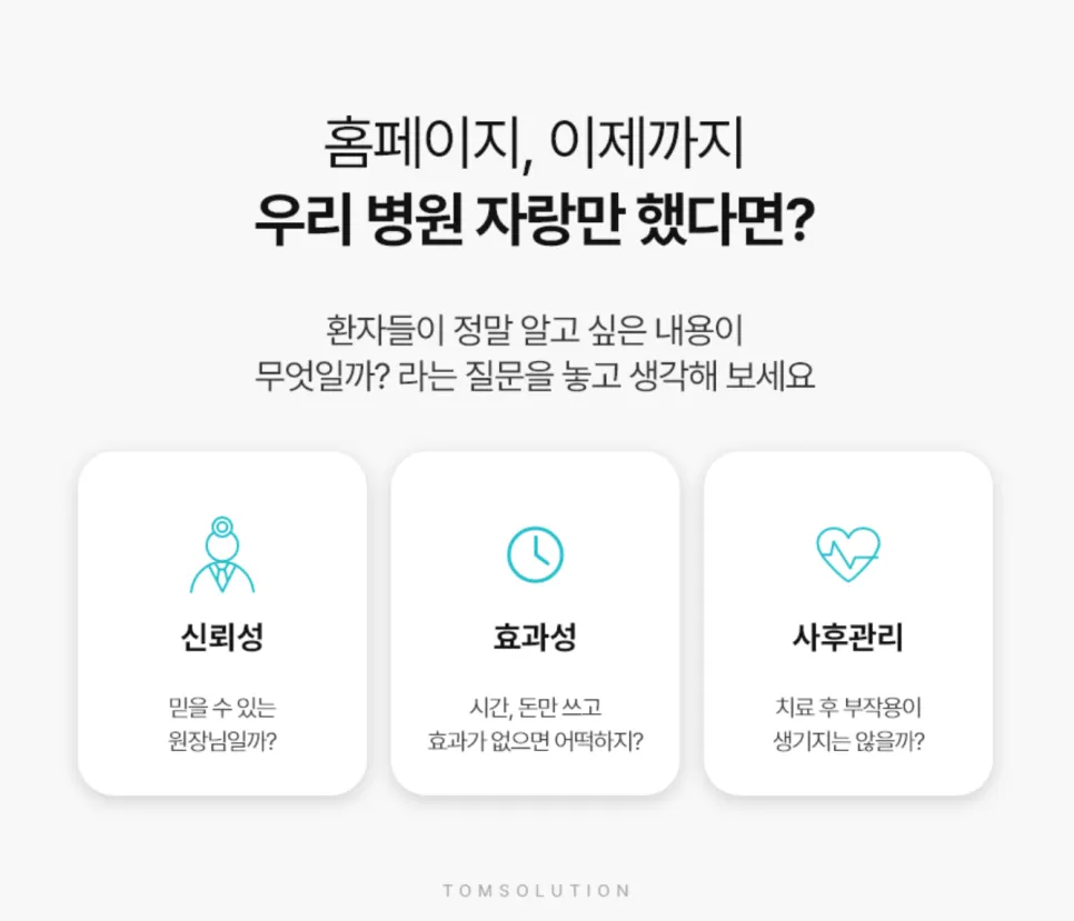 홈페이지는 병원의 얼굴과도 같습니다. 환자 입장에서는 병원을 직접 오기 전에 가장 먼저 접하는 정보가 홈페이지거든요. 그런데 적지 않은 원장님들이 개원 2~3주 전에 급하게 업체를 찾으십니다. “홈페이지야 뭐, 그냥 만들어 달라고 하면 되는 거 아닌가요?” 이렇게 말씀하시기도 하죠.