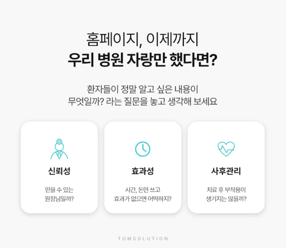 예를 들어, 중장년층 환자들이 자주 호소하는 증상 중 하나는 밤에 운전할 때 불빛이 번져 보이고, 반사광이 심해서 두렵다”는 것입니다. 이때 단순히 ‘백내장’이라는 진료 항목을 안내하는 대신, “야간 운전이 어려워졌다면?”이라는 제목의 콘텐츠로 시작해볼 수 있습니다. 그 안에 빛 번짐, 눈부심, 시야 흐림 같은 증상들을 소개하고, 그것이 초기 백내장의 신호일 수 있다는 설명과 진단 방법, 수술이 필요한 시기를 자연스럽게 연결한다면, 환자는 자신의 증상을 병원과 연결해 이해하게 됩니다.