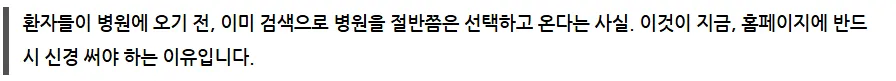 따라서 진료를 잘하는 것만큼, 그 진료가 환자에게 닿을 수 있도록 온라인 상에서 구조화되어 있는지 점검해 보셔야 합니다.