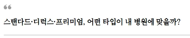 진료 내용이 많지 않고 심플하고 깔끔하게 홈페이지 제작을 원하시는 경우라면 (1)스탠다드 타입이 적합하고, 진료 내용이 많거나 마케팅이나 브랜딩을 적극적으로 진행하기를 원하신다면 (2)디럭스나 (3)프리미엄 타입을 선택하시는 것이 좋습니다.