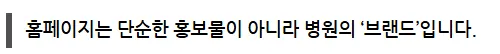 그렇다면 이러한 내용 정리와 기획을 업체에서 다 해주면 되는 것 아닐까요? 많은 원장님들이 그렇게 생각하시지만, 업체가 아무리 경험이 많더라도 병원의 특성과 진료 철학은 원장님의 머릿속에 있기 때문에 학습이 필요합니다. 이 과정을 소홀히 하면 추상적이고 밋밋한 홈페이지가 완성될 수밖에 없습니다.