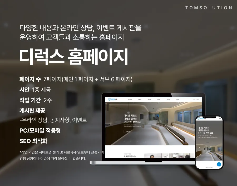 (2) 디럭스 홈페이지는 총 7페이지로 구성되어 진료과목별 특장점과 치료 내용을 상세히 전달할 수 있습니다. 특히 샘플 홈페이지가 사전에 준비되어 있어 빠르고 경제적으로 구축할 수 있습니다.