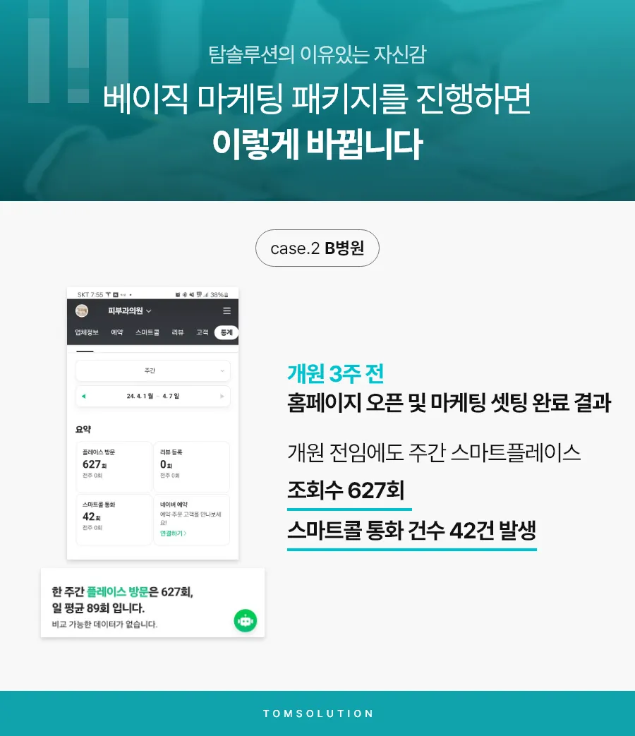 그 결과 개원 전 네이버 스마트 플레이스 조회수 600회, 전화 문의 40회 이상을 기록했고, 개원 2주 만에 신규환자 660명이 방문하는 성과를 얻었습니다. 이 사례가 보여주듯, 마케팅에도 골든타임이 있으며, 적절한 시점에 병원을 알리는 것이 환자 유입을 극대화하는 핵심 포인트입니다.를 만들어 오고 있는 저희 탐솔루션은 그동안의 포트폴리오를 저희 홈페이지에 올려 두었습니다. 오셔서 한 번 확인해 보시기 바랍니다.