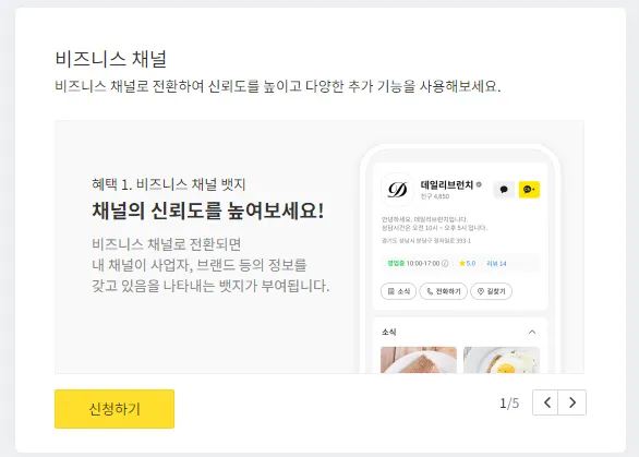 마지막으로 비즈니스 채널도 신청하시는 것을 추천 드립니다. 비즈니스 채널을 설정하시면 인증을 받은 채널로써 내 채널이 사업자 등의 인증 정보를 가지고 있다는 마크가 생기기 때문에 사람들에게도 신뢰도가 생기고, 무엇보다도 모든 비즈메시지 사용이 가능해지기 때문에 채널의 활용도가 높아집니다.