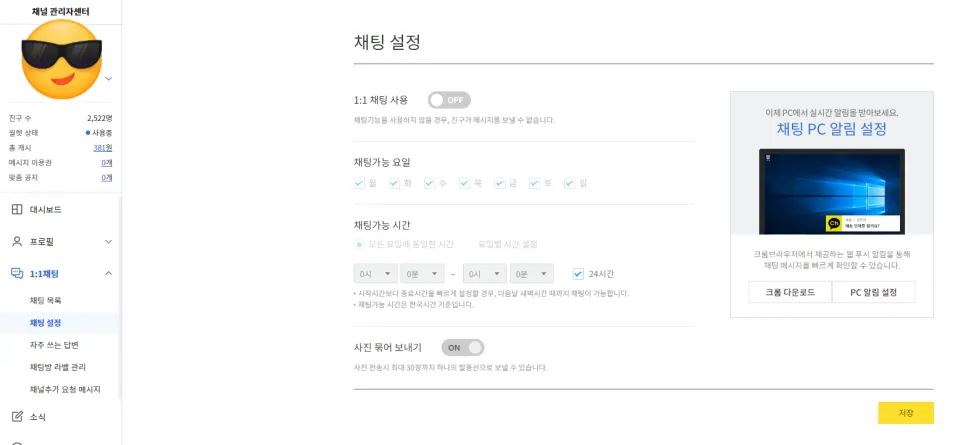 1:1채팅-채팅 설정으로 가시면 채팅이 가능한 시간을 설정하실 수 있습니다. 이때, 1:1 채팅이 오픈되어 있는 상태여야 하니 꼭 체크해주시구요. 여기서 PC알림 설정까지 클릭하시어 PC 화면에서 카카오톡 채널 채팅이 확인 가능하도록 설정하시는 것을 추천 드립니다. 업무를 보시다가도 언제든지 메시지를 통해서 빠른 응대가 가능합니다.