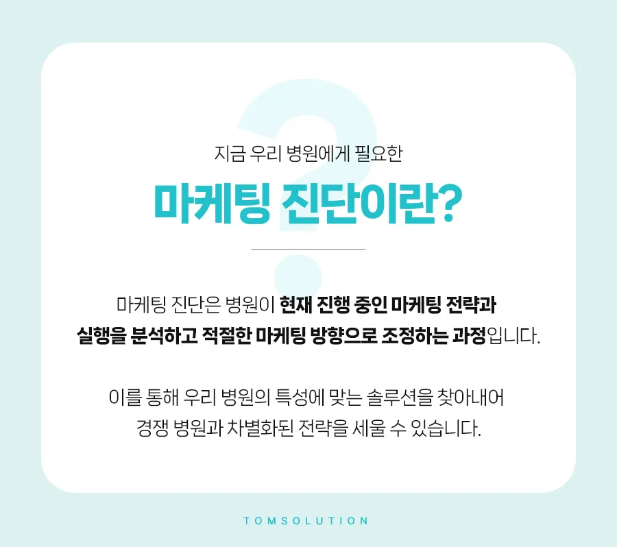 탐솔루션은 계약 전부터 우리 병원과 경쟁 병원의 현황을 분석한 마케팅 진단 리포트를 제공합니다. 이 분석을 통해 전략 기획-콘텐츠 기획-마케팅 실행-분석-개선의 흐름을 구조화하여 운영하기 때문에, 단순한 광고 이상으로 브랜드를 구축하고, 재내원 및 구환으로 이어지는 구조를 만들 수 있습니다.