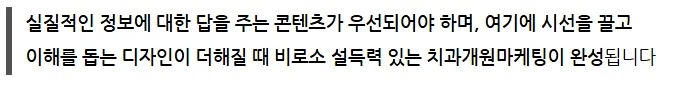 알맹이 있는 콘텐츠 기획을 중심에 두고, 그 위에 깔끔하고 세련된 디자인을 입혀 모든 매체에서 환자에게 신뢰를 줄 수 있는 구조를 만드는 것이 중요합니다.