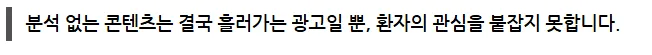 디자인이 깔끔하면 병원이 좋아 보일 것 같다는 생각, 당연합니다. 디자인이 중요하지 않다는 뜻은 아닙니다. 디자인은 환자의 눈길을 사로잡는 첫 번째 관문이지만, 그 안에 담긴 콘텐츠가 알맹이가 없으면 의미가 없습니다. 홈페이지나 블로그, 광고 배너와 같은 모든 광고 매체에서 겉모습만 예뻐서는 환자의 선택을 이끌어내기 어렵습니다.