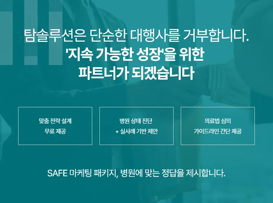 무엇보다 SAFE 패키지는 의료광고 심의 리스크를 줄일 수 있는 안전한 마케팅을 기본 전제로 합니다. 2025년부터 블로그까지 심의 대상이 되면서 많은 병원들이 혼란을 겪고 있습니다. 탐솔루션은 병원이 반드시 강조해야 할 메시지를 중심으로 콘텐츠를 설계하고, 의료법 기준에 맞춘 심의 전략까지 함께 제시합니다. 병원의 특성과 가치를 정확히 담되, 법적 문제없이 신뢰도 높은 콘텐츠로 잠재 환자의 선택을 이끌어냅니다.