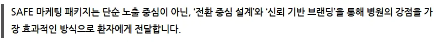 SAFE 마케팅 패키지는 키워드 광고, 병원 홈페이지 콘텐츠, 진료실 상담 자료, 브랜딩 디자인, 언론홍보 등 각 접점을 유기적으로 엮어 환자와의 신뢰를 구축합니다. 단순히 콘텐츠를 제작하고 광고만 대행하는 방식이 아니라, 병원의 방향성과 현실을 반영한 맞춤형 전략으로 기획부터 실행, 분석까지 통합적으로 관리합니다.