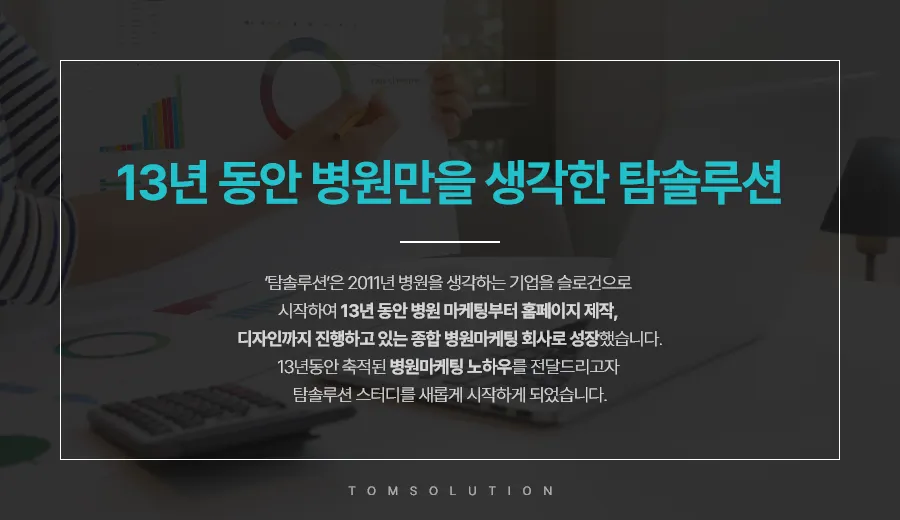 병원광고대행 마케팅은 혼자 잘해서 되는 일이 아닙니다. 병원 내부와 외부가 한 방향을 바라보고, 지속적으로 소통하며 전략을 발전시켜야 진짜 효과가 나타납니다. 탐솔루션은 병원 전문 마케팅 14년의 경험을 바탕으로 병원 운영 흐름과 진료 현실을 누구보다 잘 이해하고 있습니다.