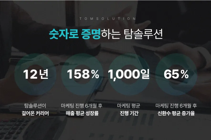 탐솔루션은 14년간 병원만을 위한 마케팅만을 해왔습니다. 수천 개 병원의 마케팅을 기획하고 운영하면서 쌓인 경험은 단순한 광고 집행을 넘어 병원의 구조적 성장을 설계하는 데 집중해왔습니다. 단지 전화문의 수를 올리는 것이 아니라, 그 문의가 내원으로, 치료로, 소개로 이어질 수 있는 여정을 만들어 드립니다.