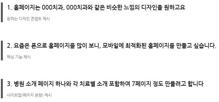 게시판이나 치료 전후 게시판, 회원 관리 기능 뿐 아니라 추가로 원하시는 기능이 있으시면 꼭 말씀해 주시고 샘플 페이지까지 같이 전달해 주시면 되십니다. 이후 대략적인 금액을 들어보시고 마음에 드신다면 다음 질문으로 넘어가시면 됩니다.