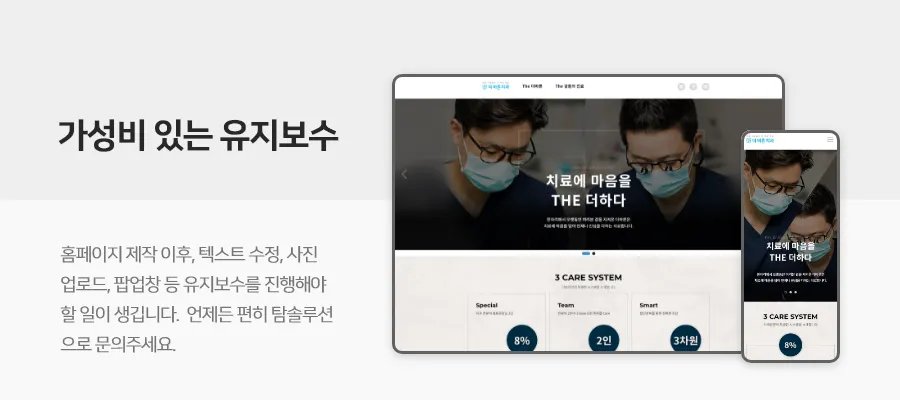 홈페이지 제작이 완료가 되어도 여러 가지 수정사항은 빈번히 발생될 수 있습니다. 이러한 관리를 내부에서 직접 인력을 두시고 처리하시기에는 어렵습니다. 따라서 병원을 운영하면서, 정기적으로 시술 이벤트를 진행하거나 원장님 진료 일정이 변하는 경우는