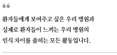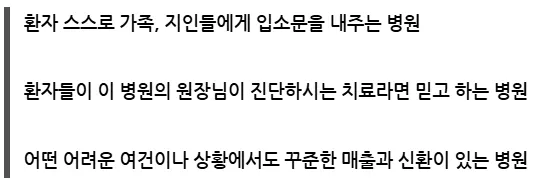 우리 병원이 단순히 치료를 위해 존재하는 병원이 아니라 환자들이 우리 병원을 떠올렸을 때 공통적인 이미지나 문장이 있다면, 모든 원장님들이 꿈꾸는 이상적인 병원을 만들 수 있습니다.