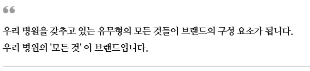 이렇게 자신의 상품이나 서비스를 다른 상품이나 서비스와 명확하게 구분 짓는 모든 요소가 '브랜드'가 됩니다. 즉, 병원을 이루는 병원명 뿐 아니라 병원을 설명하는 단 하나의 문장, 슬로건, 카피, 컬러, 로고, 공간 등