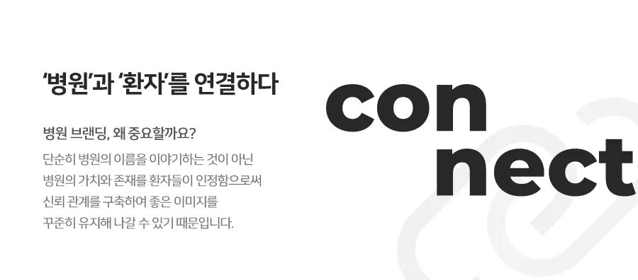 우리 병원을 환자들에게 어떻게 보여주고 싶은지는 병원을 만들면서 반드시 생각해야 할 사항입니다. 이것은 곧 바로 우리 병원의 정체성을 찾는 과정과 같습니다. 우리 병원만의 생각, 철학, 가치는 브랜드 콘셉트와 연결되어 정체성을 이룹니다. 우리 병원만이 가진 고유의 정체성으로 이미지를 만들어갈 때, 우리 병원은 브랜드가 됩니다.