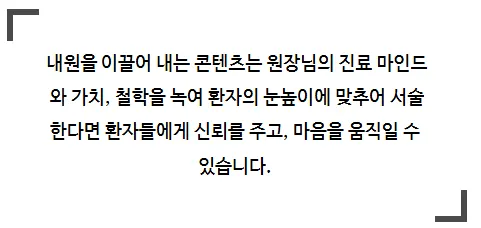 그런데 일반인들이 보기에는 병원이 다 잘하는 것 같아서 어디로 가야할 지 고민하는 경우가 많습니다. 이 과정에서 블로그는 결정적인 역할을 합니다. 그런데 병원 블로그들을 보면 어떤가요? 자랑 일색의 글과 이미지로 도배되어 있습니다. 글을 한 번이라도 유심히 읽어 보신 분이라면 부산병원블로그대행 시, 상위 노출 로직 반영을 위해 말이 안 되는 " ~했었어요" 와 같은 어색한 어미로 붙어 있는 걸 보셨을 것입니다. 또한 이미지는 눈에 들어오기는 하지만 이해하기 어려운 용어로 무슨 말인지 직관적으로 와닿지가 않죠. 정작 글을 읽는 사람, 환자를 배려하지 않은 포스팅입니다.