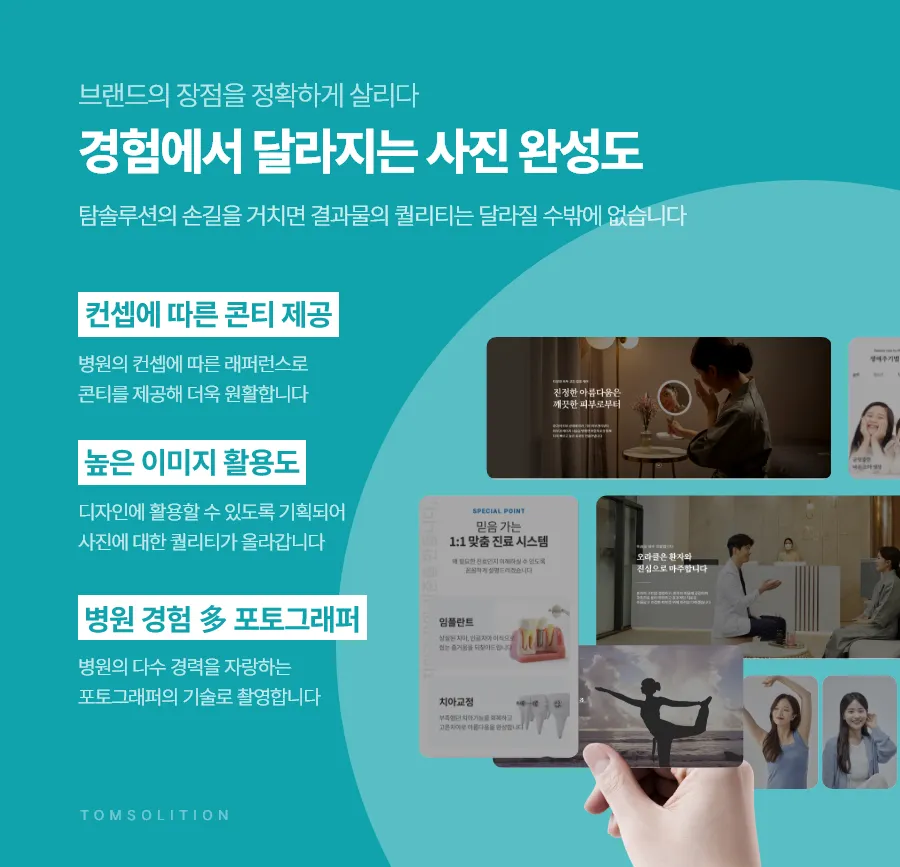 탐솔루션은 치과 전문 홈페이지 제작과 마케팅, 그리고 사진 촬영까지 15년 이상의 전문 경험을 바탕으로 원장님의 치과를 하나의 일관성 있는 메시지로 묶어 냅니다. 사진만 잘 찍는 것이 아니라, 사진이 홈페이지와 마케팅 콘텐츠 속에서 어떻게 활용되어야 환자에게 가장 큰 신뢰로 이어질 수 있는지를 설계해 드립니다.