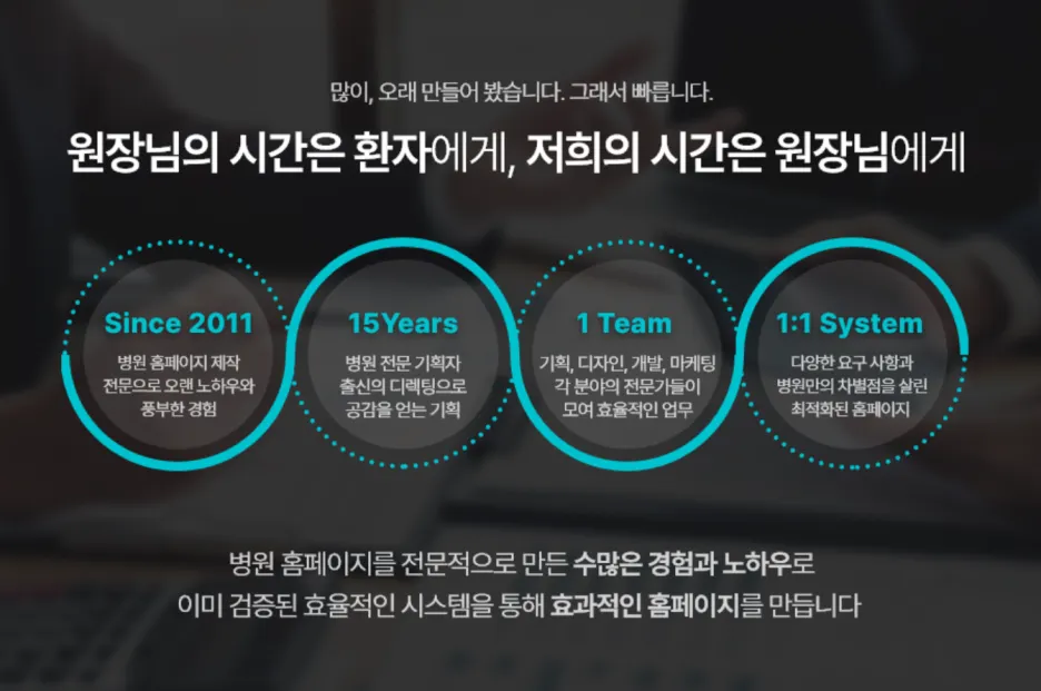 단점은 공장식 사이트이기 때문에 우리 병원만의 색깔과 가치를 반영하거나 구조를 바꾸거나 이미지를 만드는 데 한계가 있다는 점입니다.