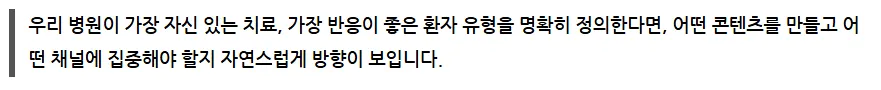 이 질문들에 대한 답이 바로 병원의 방향성과 콘텐츠, 그리고 향후 마케팅 전략의 중심축이 되기 때문입니다.