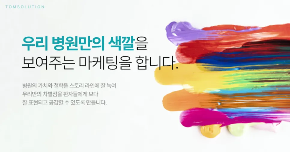 치과마케팅업체 탐솔루션은 병원의 숨겨진 이야기를 발굴해 브랜드로 만듭니다. 이 과정은 마케팅을 단기 비용이 아닌, 가치를 높이는 투자로 전환시킵니다.